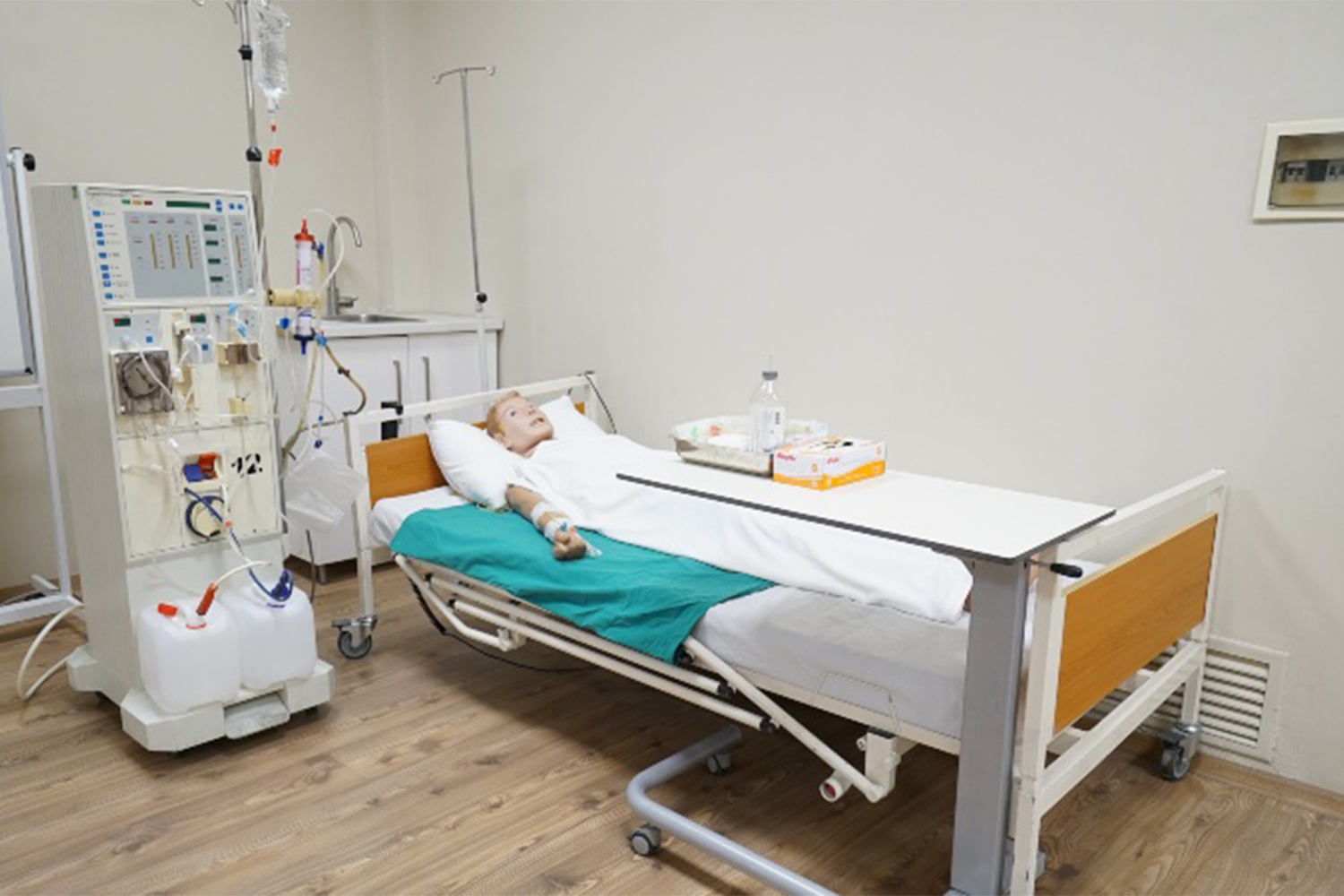 Diyaliz laboratuarında öğrencilerin klinik eğitime çıkmadan önce diyaliz makinesinin parçalarını tanıyabilmeleri ve makineyi çalışmaya hazır hale getirebilmeleri için makine setlemenin