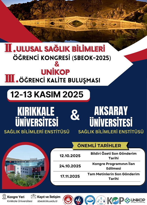 Kırıkkale Üniversitesi Sağlık Bilimleri Enstitüsü ile Aksaray Üniversitesi Sağlık Bilimleri Enstitüsü iş birliğinde bu yıl 2.si düzenlenecek olan “II. Ulusal Sağlık Bilimleri Öğrenci Kongresi” & UNİKOP III. Öğrenci Kalite Buluşması (SBEOK-2025) Kırıkkale Üniversitesi ev sahipliğinde 12-13 Kasım 2025 tarihleri arasında gerçekleştirilecektir.