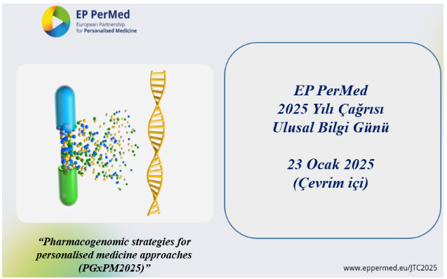 Kişiselleştirilmiş Tıp için Avrupa Ortaklığı (EP PerMed) projesi 2025 yılı çağrısı Aralık ayında başvuruya açılmış olup, 24 ülkeden 35 fon kuruluşu çağrıda yer almaktadır. “Pharmacogenomic strategies for personalised medicine approaches (PGxPM2025)” başlıklı 2025 yılı çağrısının 1. aşama uluslararası başvuruları 18 Şubat 2025 (14:00 CET) tarihinde sona erecektir.