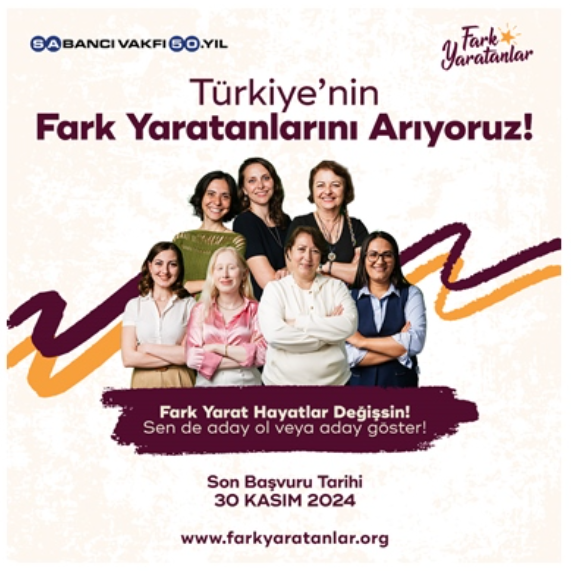 Sabancı Vakfı, toplumsal gelişmeye katkıda bulunan kişi ve kurumların hikayelerini ve çalışmalarını tüm Türkiye ile paylaştığı Fark Yaratanlar Programı ile farkındalık yaratmayı ve ilham vermeyi amaçlıyor. 16.Sezonunda “Fark Yarat Hayatlar Değişsin!” sloganıyla çevre, eğitim, ekonomik gelişme, sağlık, toplumsal adalet ve yurttaş katılımı alanlarından başvuru alan programa, 1 – 30 Kasım 2024 tarihleri arasında başvurular açıktır.